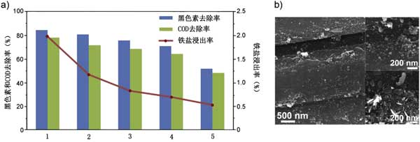 活性炭催化劑去除黑素廢水的測試中。發現殼聚糖涂覆在活性炭上以穩定納米零價鐵,并且發現與物理吸附過程相比,化學交聯導致殼聚糖更多地附著于活性炭。在固定條件下,活性炭的COD去除率和黑色素顏色去除率分別為76.2%和84.7%。在可重復使用測試下,活性炭處理黑色素廢水五個周期后,發現COD/脫色效果不會顯著降低。重要的是,該活性炭催化劑的特點是在重復處理過程中鐵的浸出率極低,從而降低了鐵泥污染環境的可能性。總而言之,較高的脫色效率和較低的H 2 O 2降低了活性炭的消耗,廢水中負載型催化劑的易于回收,多次循環的可重復利用性以及低鐵的浸出,是一種出色催化劑。