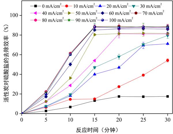 電流密度是一個關鍵參數,它不僅影響凝結劑的用量,還影響氣泡的形成速率,氣泡的大小和絮凝物的生長。各種選定的電流密度:0、10、20、30、40、50、60、70、80、90和100mA/cm2在批量實驗中應用了,以建立電凝與活性炭耦合過程的有利電流密度范圍。在30分鐘的反應時間下使用鋁不銹鋼陽極/陰極電極對進行連續電凝工藝,并使用反應器中的活性炭濃度為0.2g/L來研究電流密度對硫酸鹽的影響去除效率。與活性炭吸附工藝相比,電凝加活性炭即使在低電流密度(10mA/cm2)時也可以顯著提高去除效率。如圖2所示,活性炭吸附過程和電凝活性炭吸附偶聯過程的去除效率在5分鐘時分別為2.7%和6.3%,在30分鐘時分別為17.5和54.2%。由于偶合體系中的反應比簡單的活性炭吸附過程更復雜,因此去除效率有所提高。電凝結合活性炭吸附對硫酸鹽去除效率有重要影響。結果表明,去除效率隨著電流密度的增加而顯著提高。電流密度為70mA/cm2時,去除效率最高(88.9%)。這種現象可以歸因于這樣的事實,即在高電流密度下,氧化金屬的數量增加,從而導致大量的Al(OH)3(s)顆粒有利于去除污染物。