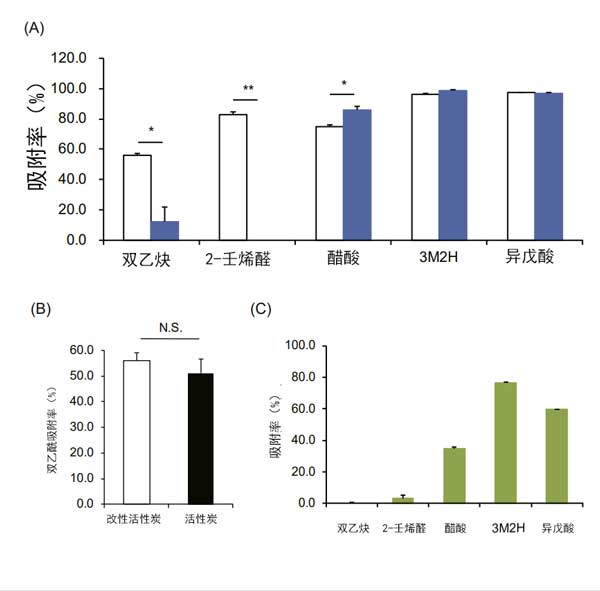我們測試了活性炭對五種散發惡臭的揮發性有機化合物的吸附能力。發現活性炭對二乙酰基和2-壬烯醛的吸附水平均高于氧化鋅。但是,與醋酸氧化鋅相比,活性炭的吸附效果略低(圖3A)。相反,活性炭和氧化鋅對3M2H和異戊酸的吸附能力之間沒有顯著差異。為了比較活性炭和改性活性炭中所含活性炭的吸附能力,使用無法吸附在二氧化鈦上的二乙酰基測試了相同量活性炭中的吸附水平。發現與活性炭相比,改性活性炭的吸附能力沒有顯著變化(圖3B)。
