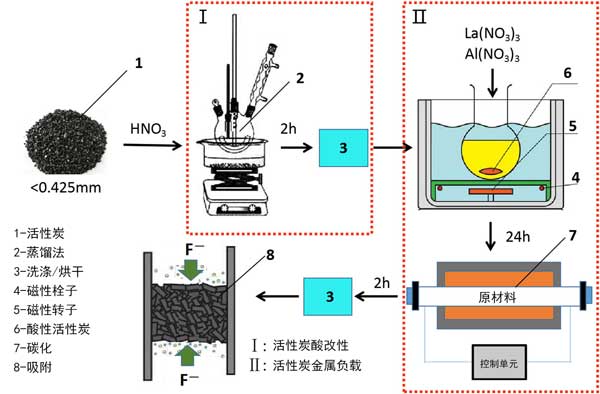 鑭鋁改性活性炭的制備包括兩個步驟:酸改性過程(I)和鑭-鋁加載過程(II)。方法I涉及特定質量分數的硝酸(HNO3)。將HNO3和活性炭混合在燒瓶中,將燒瓶置于75°C的恒溫水浴中保持2小時。然后,將活性炭洗滌至中性并在100℃下干燥3小時,從而獲得酸改性的活性炭。用鑭(NO3)3·2H2O和鋁(NO3)3加載鑭和鋁的酸改性活性炭。將10g酸改性活性炭在100mL鑭(NO3)3·2H2O和鋁(NO3)3的混合溶液中攪拌24小時。然后,將固體產物在氮氣下于300°C的管式爐中碳化兩小時,冷卻至室溫后,完成鑭鋁改性活性炭,制備和吸附過程示意圖如圖1所示。鑭鋁改性活性炭將用作氟化物的吸附劑。
