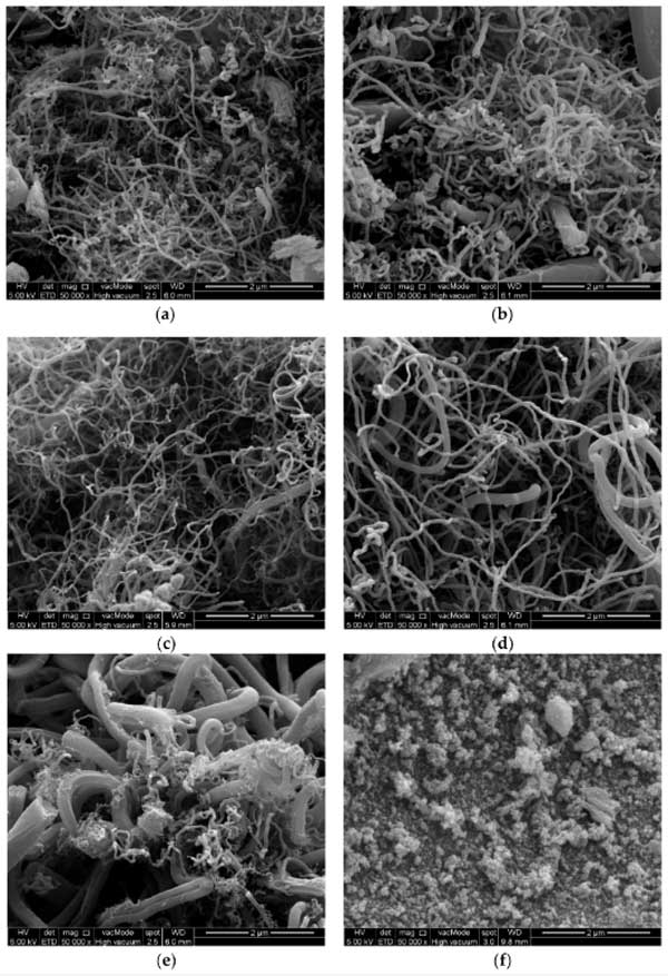 用FESEM技術分析了合成樣品的形態特征。圖2a-f顯示了放大的50,000倍的六個選定活性炭樣品圖像。圖2c顯示了活性炭5的FESM圖像,通過使用5%的鐵作為單催化劑和40分鐘的反應時間,發現炭產率和接觸角較高。在此樣本中發現了兩種類型的碳納米材料,分別是碳納米纖維和多壁碳納米管。圖2f顯示了活性炭3的FESEM圖像,該圖像是通過使用4%的鈷作為單催化劑和40分鐘的反應時間制備的。發現僅使用大量的鈷作為催化劑產生非常差的炭產率,這表明材料制備得不怎么好。圖2e顯示了活性炭4的FESEM圖像,該圖像是通過使用5%的鐵和4%的鈷作為雙金屬催化劑制備的,反應時間為40分鐘。該圖像表明,使用大量的鈷和鐵時,主要生成聚集的炭納米材料和碳納米纖維,因為這樣的實驗條件不是優選的。