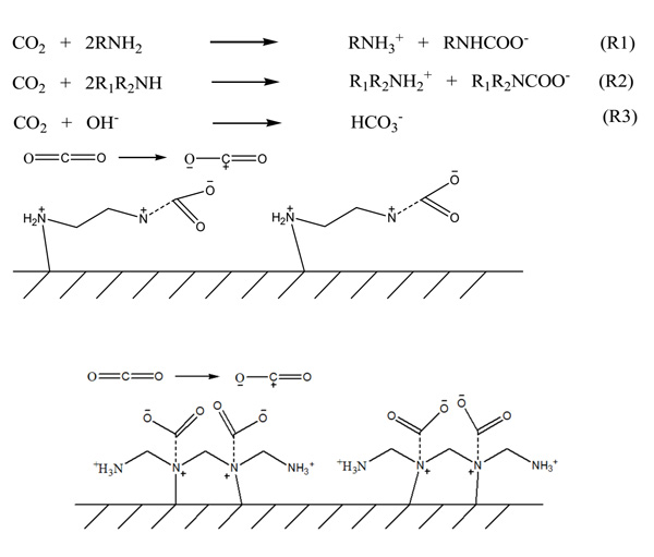 圖2:胺官能化活性炭表面上的乙二胺和三亞乙基四胺與二氧化碳之間的擬議反應(yīng)機(jī)理。