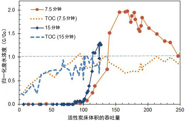 空床接觸時間對突破的影響說明如下:圖2用于123-三氯丙烷。盡管7.5分鐘和15分鐘EBCT的123-三氯丙烷突破的開始是相似的,但在100,000床體積之后,與7.5分鐘EBCT相比,15分鐘EBCT的突破更早。更長的EBCT容量降低可能是活性炭結垢的結果,這是由于更強的吸附力和不可置換的DOM到達吸附床的更深處,并超過了目標有機物的吸附位點和/或覆蓋了活性炭顆粒的孔而導致的。時間并防止進一步的目標有機物吸附。通過比較相似突破點的吞吐能力差異,說明了EBCT對其他cVOC的活性炭性能的影響,其中負值表示在15分鐘EBCT時容量更大,正值表示在7.5分鐘EBCT時容量更大(或在15分鐘EBCT時容量較小)。床體積數量達到突破的10%,50%或75%的平均容量差異(不包括VC,因為未評估15分鐘EBCT)分別為-0.1%,9%和13%,表明在運行時容量沒有損失。15分鐘的EBCT突破了10%,突破了適度的容量,因為更長的EBCT結垢了,因此突破了50%和75%。