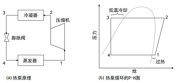 熱泵是空調的熱力學原理,可以基于狀態點的熱物理特性來預測熱泵的熱力學性能。圖2(a)顯示了典型熱泵的示意圖,圖2(b)顯示了壓力-焓線圖上的熱泵循環。在我們的模擬中,不僅計算了每種狀態下的熱物理性質,而且還計算了蒸發器和冷凝器中的熱交換過程。由于換熱器規格的可用性限制,所以將換熱器建模為雙管逆流式換熱器,該換熱器用于我們的實驗裝置中。