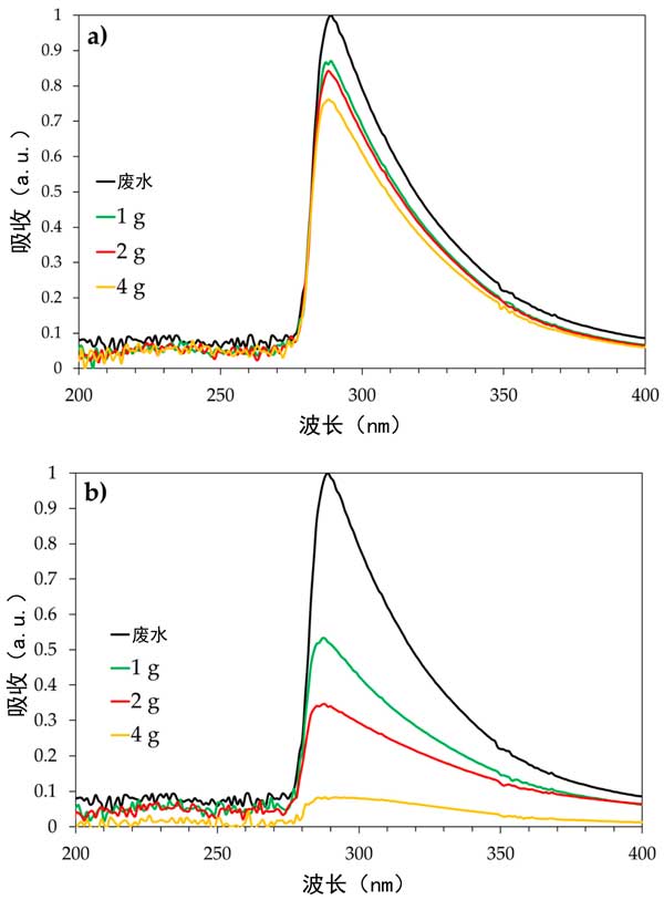 經過測試發現用活性炭來處理洗滌塔廢水中的苯酚是比較好用的。然而,從工藝圓度的角度來看,將生物炭樣品用于廢水處理也有些特點。實際上,在生物質氣化過程中產生的焦炭被認為是低價值的材料,用途非常有限,可以作為工藝廢物流處理。因此,利用生物質氣化炭作為吸附劑材料處理合成氣濕法清潔過程中產生的廢水可能是其增值的策略。氣化產生的生物炭可被視為零值產品(如果將其作為廢物處置,則可能為負值),而熱解產生的生物炭通常具有正的生產成本,因為它是該過程的目標產品。因此,盡管生物炭樣品對苯酚的吸附能力最低,但仍被研究為潛在的吸附劑,用于處理基于生物質的氣化廠中產生的實際洗滌塔廢水。為了進行比較,還對1000碘活性炭樣品的實際合成氣洗滌塔廢水的凈化能力進行了研究,圖3報告了處理24小時后合成氣洗滌塔水的UV-Vis光譜與活性炭含量的關系。