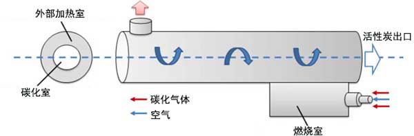 為了使用碳化副產物,設計了一個燃燒室,用于處理揮發物(氣態和焦油化合物),以提供碳化活性炭所需的熱量。碳化爐采用套筒式設計,旋轉碳化爐的結構如圖2。生物質材料在內缸中移動,熱煙道氣在外缸中流動。煙道氣是通過在燃燒室中燃燒部分碳化揮發物而產生的,該煙氣提供了內缸中的干燥和碳化反應所需的熱量。爐子的詳細尺寸如下:碳化室和外部加熱室的直徑分別為400毫米和700毫米。旋轉爐的長度是3000mm。燃燒室的長度為1200毫米。碳化氣體入口的直徑為16mm,空氣入口的直徑為10mm。