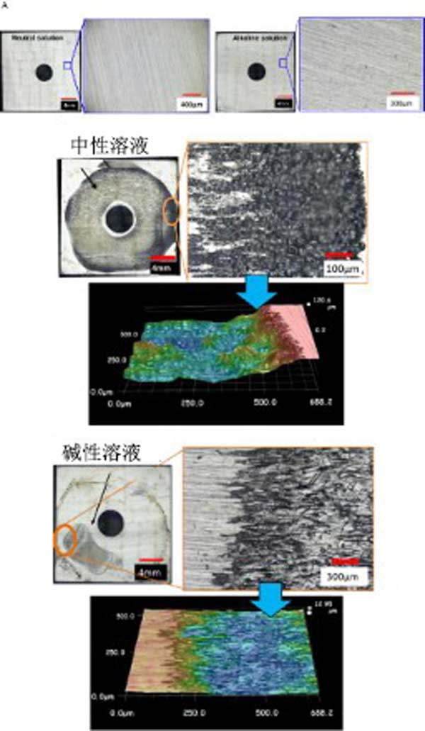 使用光學顯微鏡觀察實驗后樣品的表面形態,如圖3所示。在中性和堿性溶液中未與活性炭接觸的樣品中未觀察到縫隙腐蝕。另一方面,在中性和堿性測試溶液中與活性炭接觸的樣品上發生縫隙腐蝕。這些結果清楚地表明,當樣品與活性炭接觸時,縫隙腐蝕敏感性增加。在中性測試溶液的情況下,最大腐蝕深度為130μm并且縫隙腐蝕傳播以覆蓋樣品的幾乎所有褶皺區域。在堿性測試溶液的情況下,最大腐蝕深度為25μm并且腐蝕區域遠小于中性溶液的情況。這些結果表明,在中性溶液的情況下腐蝕區域和深度更大,這表明在吸附塔中發生實際腐蝕。在堿性溶液的情況下腐蝕面積和深度較小的原因被認為是Fe(OH)2的溶解速率的事實堿性溶液減少,這導致腐蝕速率降低;旧希陉枠O部位的pH降低至去鈍化pH是縫隙腐蝕開始和傳播所必需的?紤]到這個方面,還可以解釋縫隙腐蝕行為的差異。